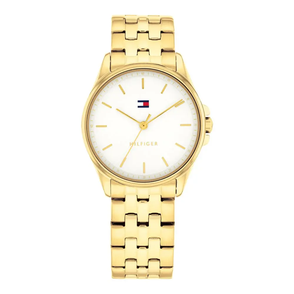 Montre bracelet mailles acier doré, boitier doré, cadran blanc