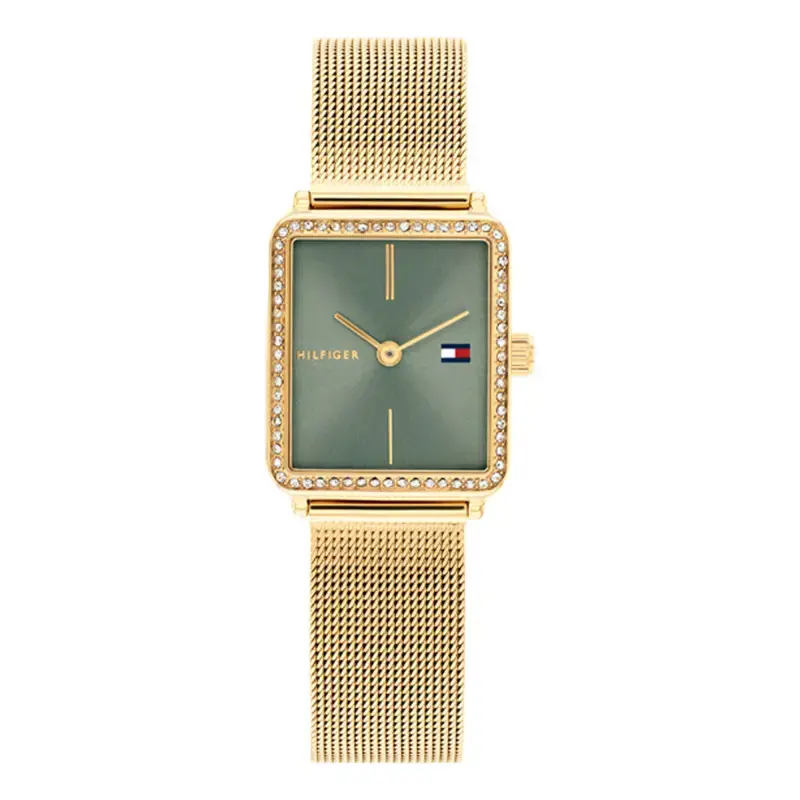 Montre bracelet acier milanais doré, boitier doré avec strass, cadran vert/gris