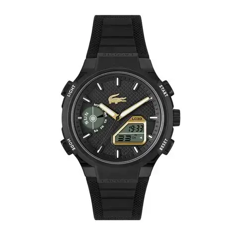 Montre Bracelet noir silicone , boitier noir avec aiguilles blanches et détails dorés, éclairage LED , heure/date, chronomètre,alarmes