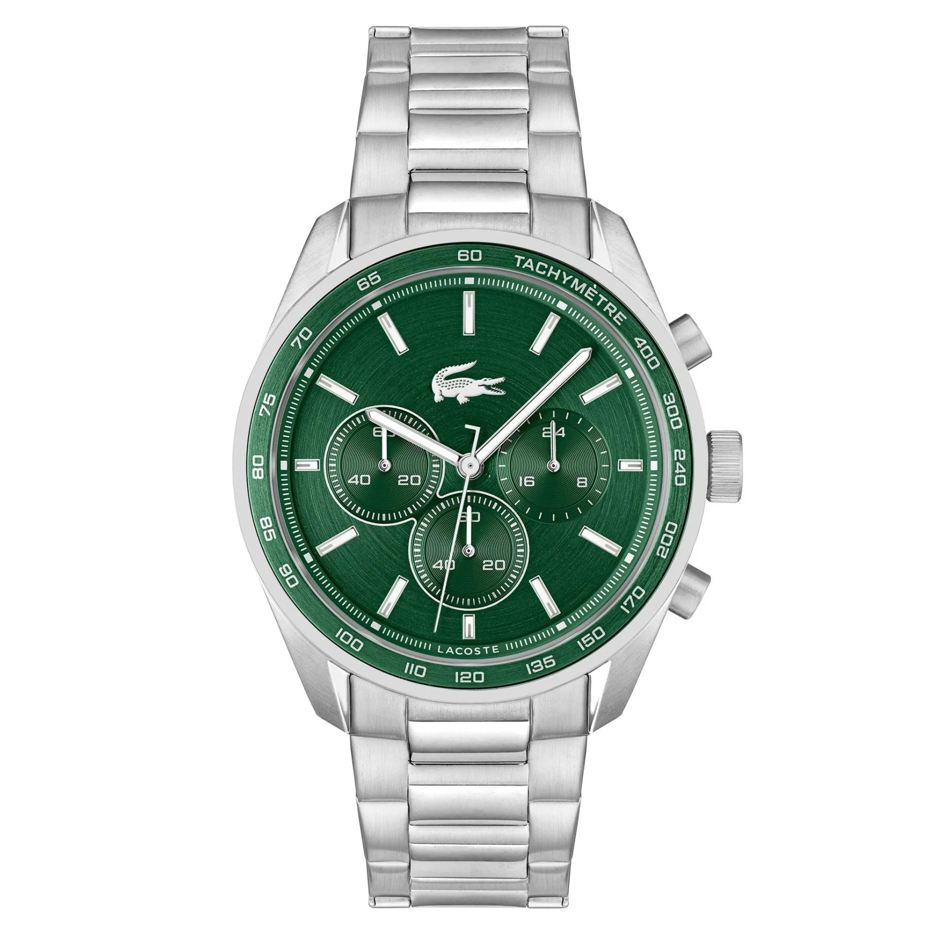 Montre tachymètre chronomètre bracelet mailles acier , cadran vert avec jour date et indications 12/24h