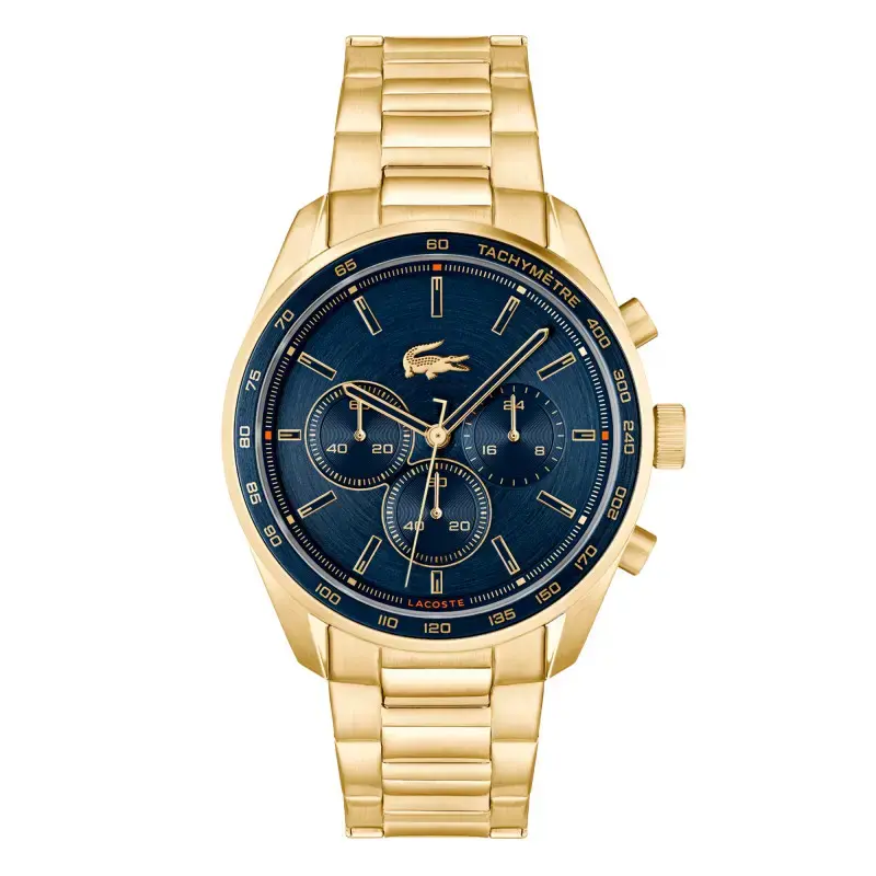 Montre tachymètre chronomètre, bracelet acier doré , cadran bleu avec indications 12/24h, jour et date